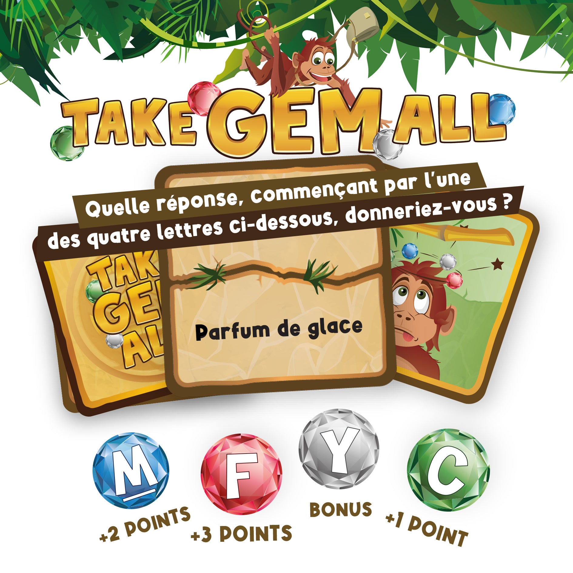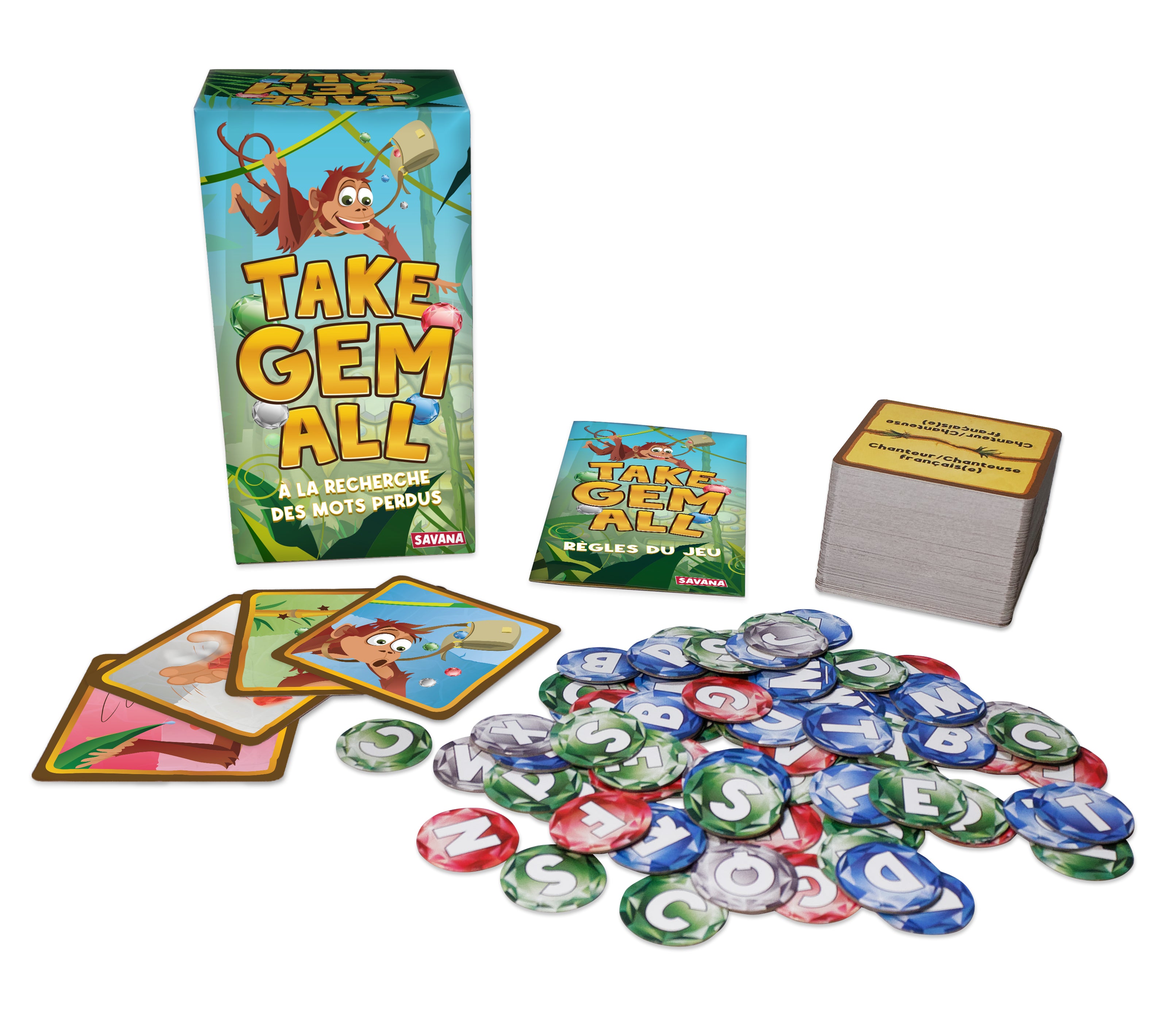 🎉 TAKE GEM ALL est un jeu de société qui mélange le meilleur du jeu du petit bac et du jungle speed dans un jeu de cartes simple et rapide. Le jeu parfait pour mettre l'ambiance !